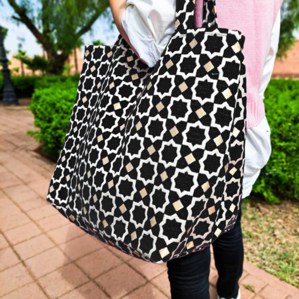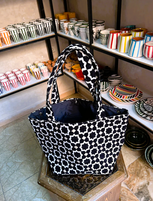 Deze Marokkaanse boho tas met zwart-wit zellige motief combineert elegantie en traditie. Handgemaakt van stevig textiel, perfect voor dagelijks gebruik. De ruime tas biedt stijl en functionaliteit, ideaal voor reizen, winkelen of stranddagen. Tijdloos design met een authentieke uitstraling.